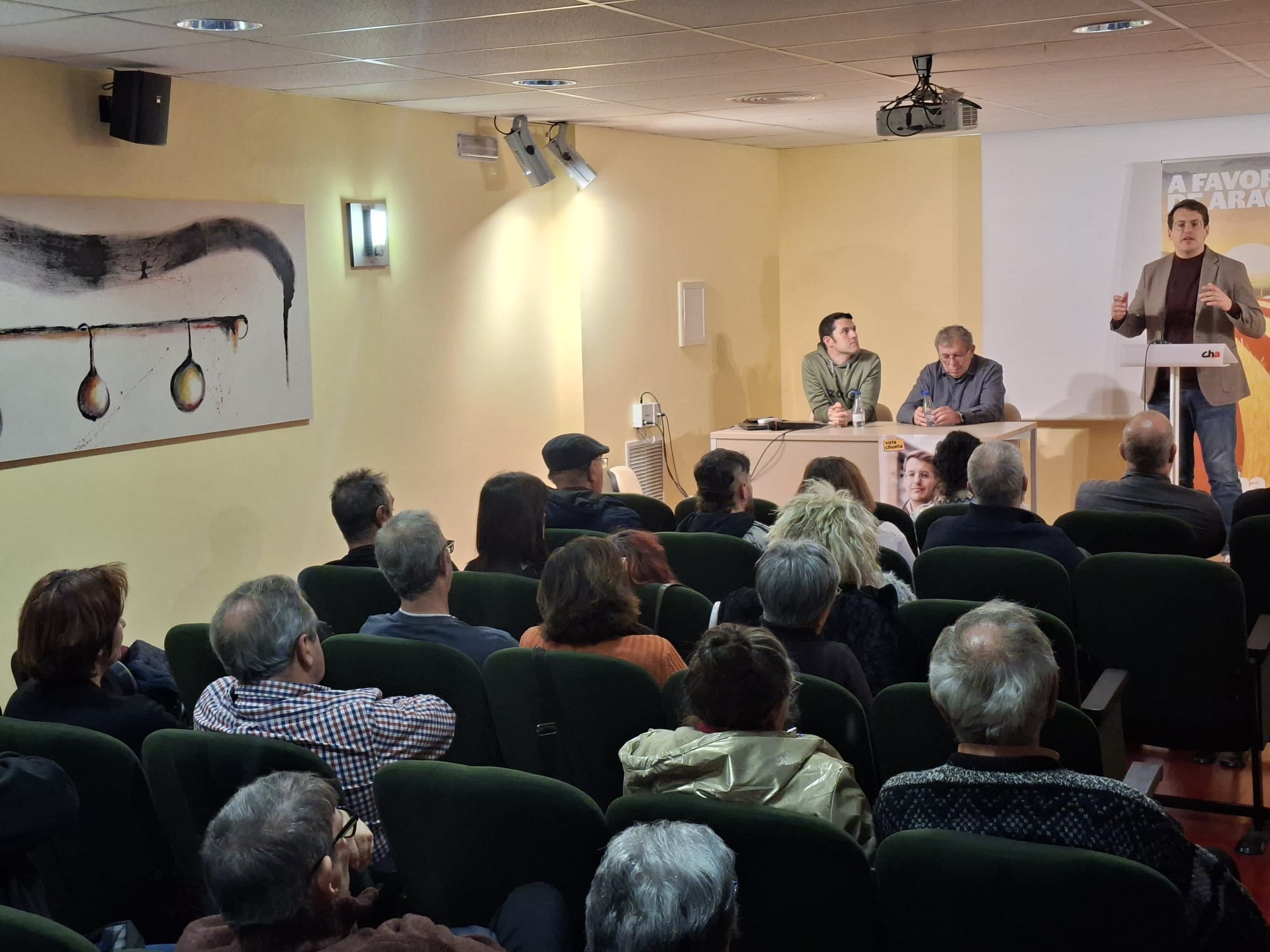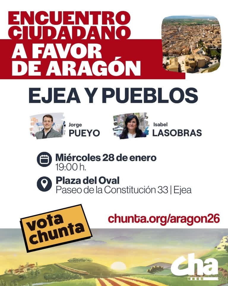 [Caspe, 26/01/2026]. El candidato de CHA a la presidencia de Aragón, Jorge Pueyo, ha visitado esta tarde las localidades de Maella y Caspe. En esta última ha atendido a los medios de comunicación y se ha reunido con representantes de la plataforma contra la línea de muy alta tensión (MAT) Escatrón-Els Aubals-La Secuita, antes de celebrar un acto público en la Casa de Cultura de Caspe, acompañado por Adrián Tello, alcalde de La Muela, y Rafa Lumbreras, concejal de CHA en el consistorio caspolino, ambos miembros de la candidatura por la circunscripción de Zaragoza. Contina leyendo