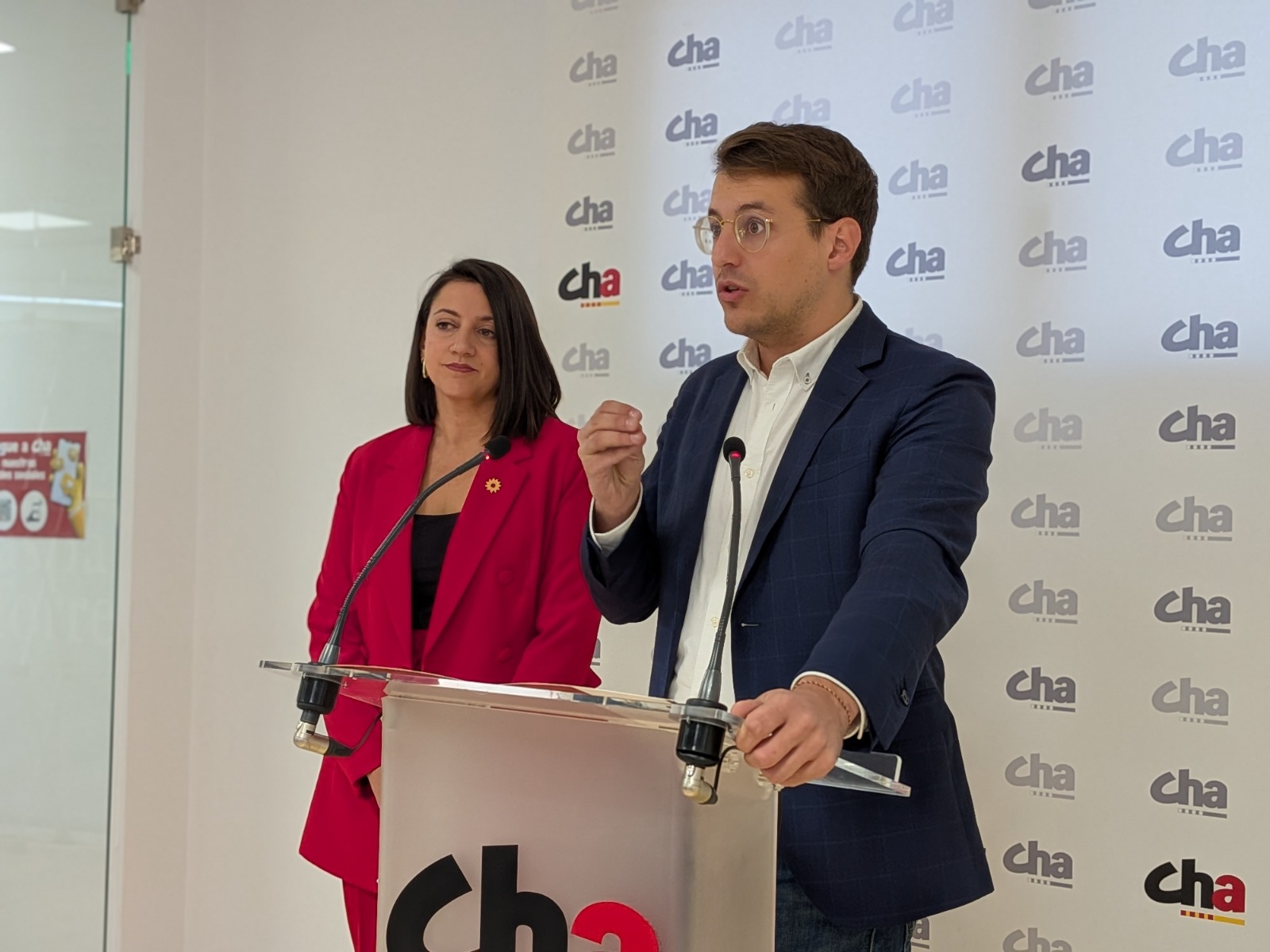 [Zaragoza, 21 de noviembre de 2025] El diputado de CHA y portavoz adjunto del Grupo Plurinacional Sumar en el Congreso, Jorge Pueyo, y la coportavoz del Partido Verde, Mar González Báez, han comparecido ante los medios de comunicación aragoneses para anunciar la presentación de la proposición no de ley para una planificación sostenible y transparente en el consumo de recursos de la industria de los centros de datos, para su debate en la Comisión de Transición Ecológica y Reto Demográfico del Congreso.