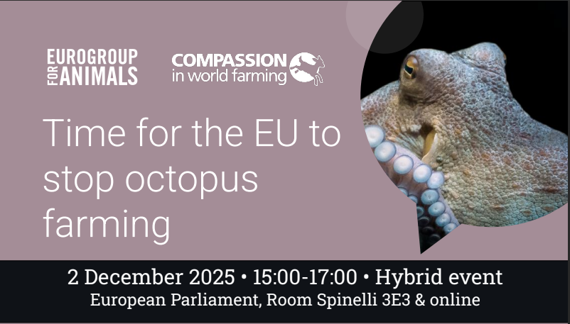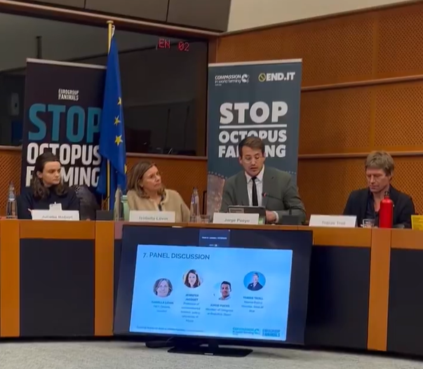 [Comunicado] 03/12/2025. APDDA, representada por el diputado Jorge Pueyo, ha participado en el evento «Es hora de que la UE detenga la cría de pulpo» («Time for the UE to stop octopus farming»), organizado por Eurogroup for Animals y Compassion In World Farming (CIWF), que tuvo lugar en el Parlamento Europeo el 2 de diciembre de 2025, con la participación de diversos expertos.