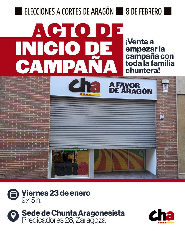 ¡INICIAMOS LA CAMPAÑA! Por el luto de estos días por la tragedia ferroviaria de Adamuz, los partidos acordamos retrasar el inicio de campara que no va a ser esta medianoche como es tradicional. Será mañana viernes. Te esperamos a las 9:45 de la mañana en la sede de CHA (c/ Predicadores, 28. Zaragoza) para levantar la persiana y abrir nuestras puertas a favor de Aragón.