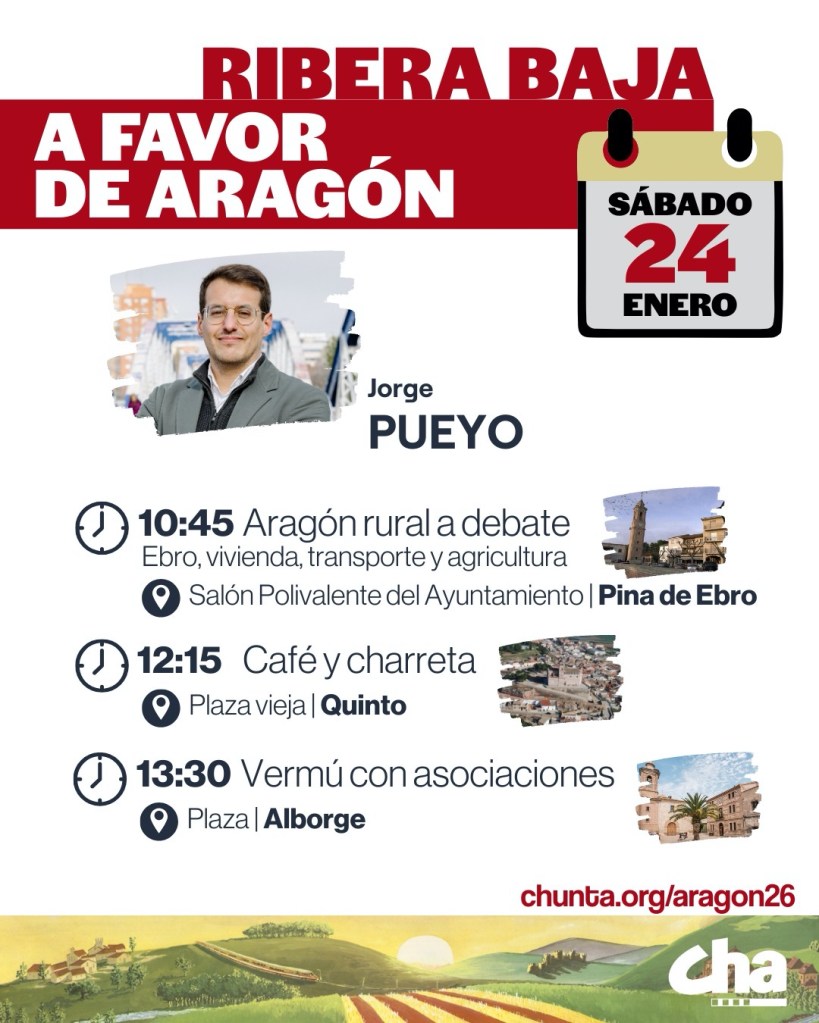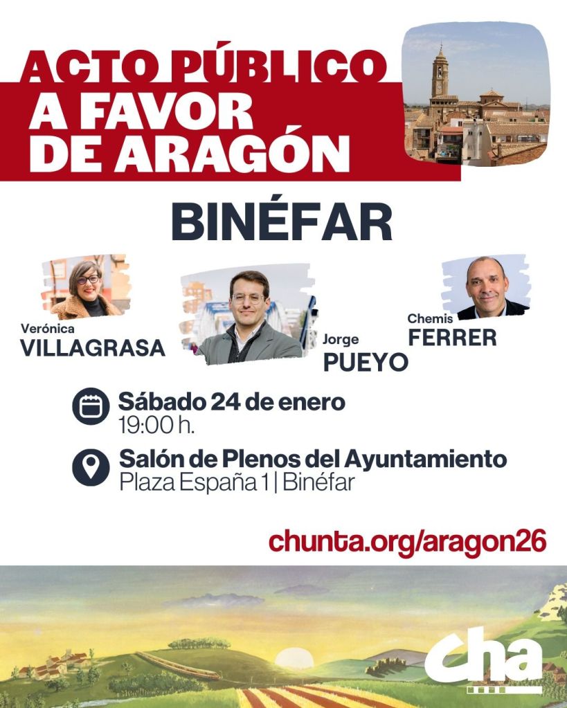[Zaragoza, 23 de enero de 2026] Chunta Aragonesista ha celebrado el acto principal de inicio de campaña en su Sede Nazional, en Zaragoza. El candidato a la Presidencia del Gobierno de Aragón, Jorge Pueyo, acompañado por miembros de la candidatura, como Isabel Lasobras, Miguel Jaime, Mary Carmen Bozal o Adrián Tello, ha atravesado las puertas de la sede, revestidas con el cartel electoral, cuyo diseño recupera elementos del primero que utilizó CHA en las elecciones de 1987, obra de Begoña Chaves. Contina leyendo