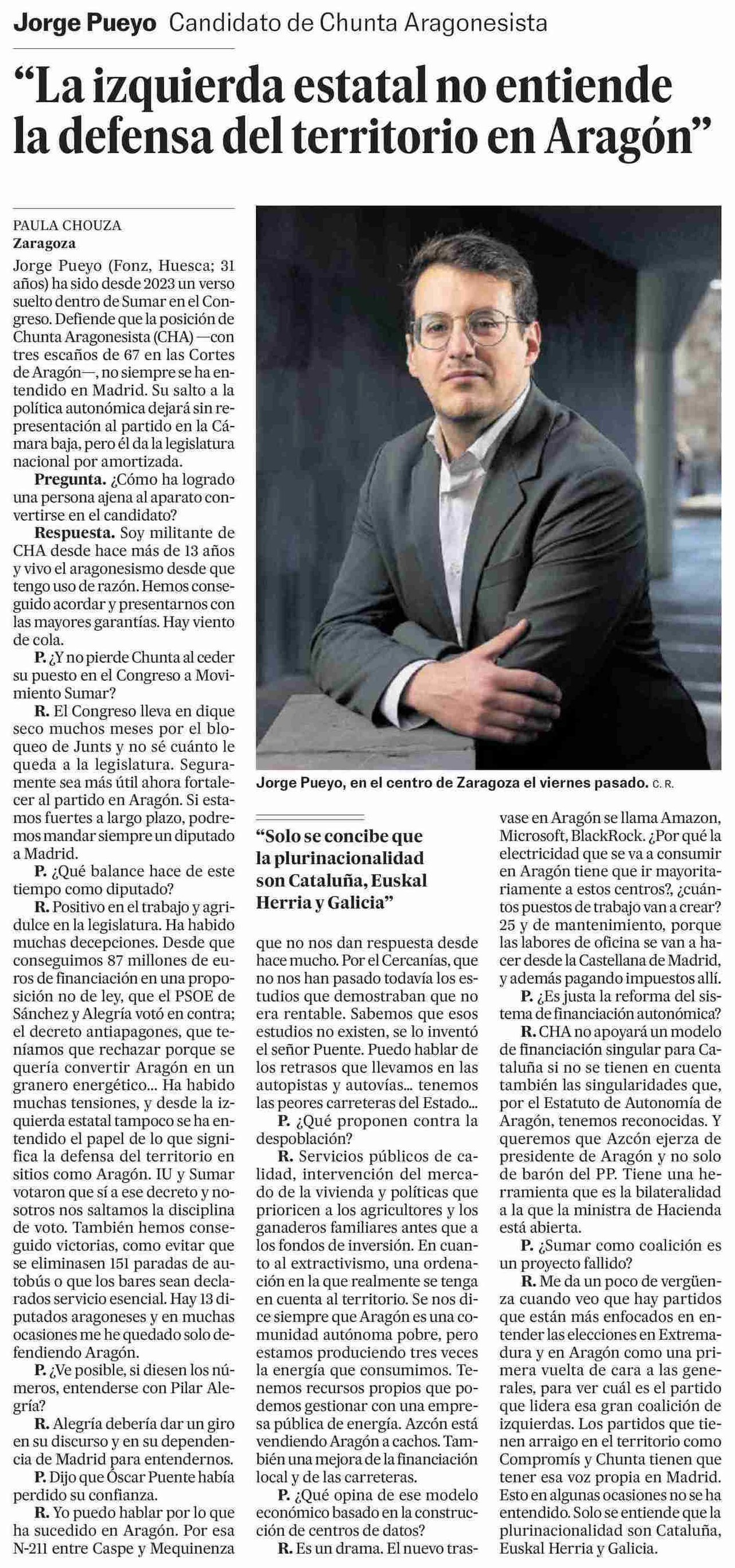 El candidato de Chunta Aragonesista, hasta ahora diputado, critica la “dependencia” del PSOE de Madrid y pide a Azcón que no ejerza solo de “barón del PP”. [Sigue leyendo en El País o amplía la imagen de la edición en papel].