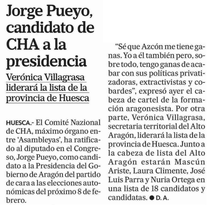- Quién es Jorge Pueyo, candidato de CHA en las elecciones autonómicas en Aragón: “En todas mis facetas he defendido siempre lo aragonés”. (Heraldo, 6/02/2026).