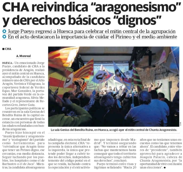 - Pueyo dice que CHA es la herramienta del “municipalismo, ecologismo, feminismo y antifascismo, y de defensa del Pirineo”. (El Diario de Huesca, 4/02/2026).