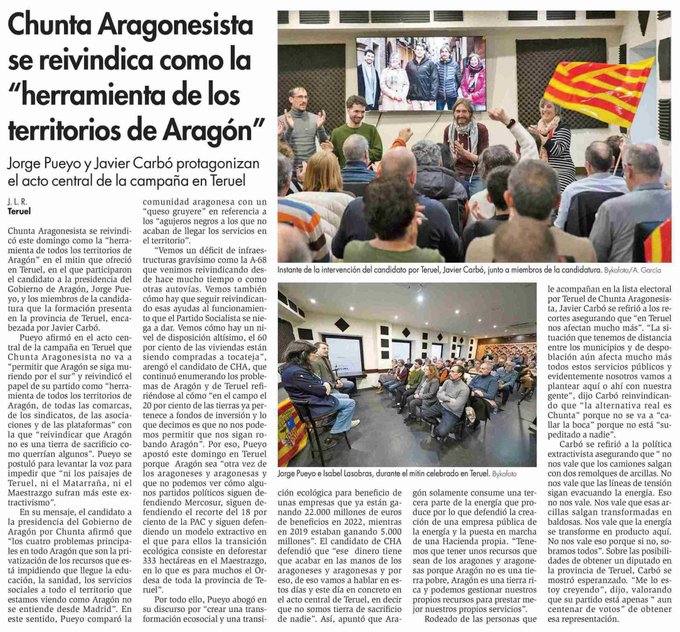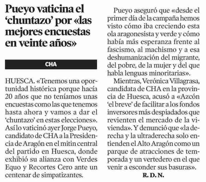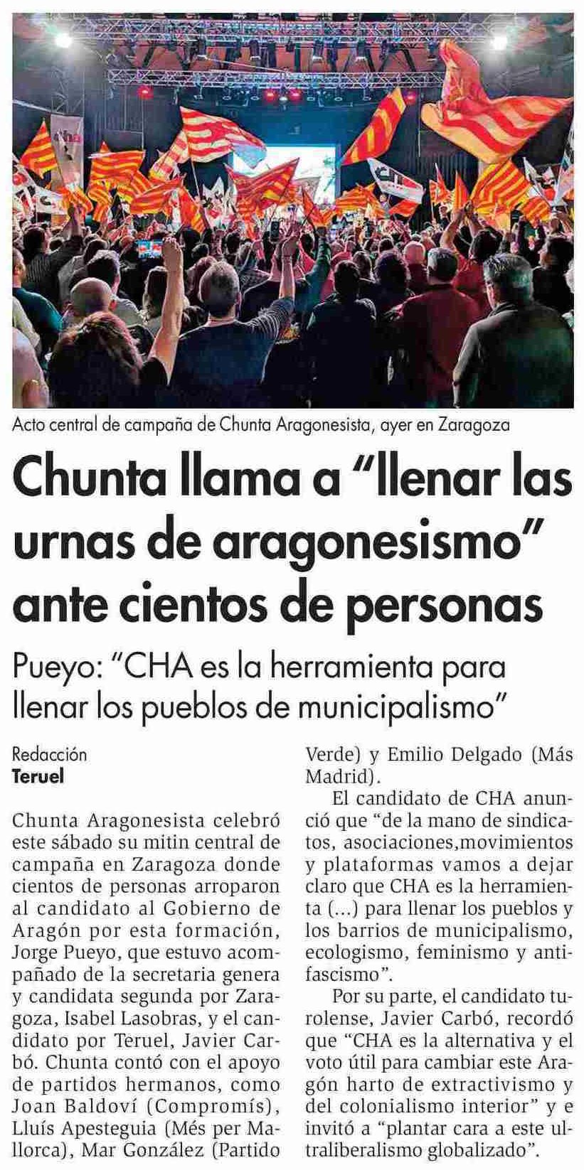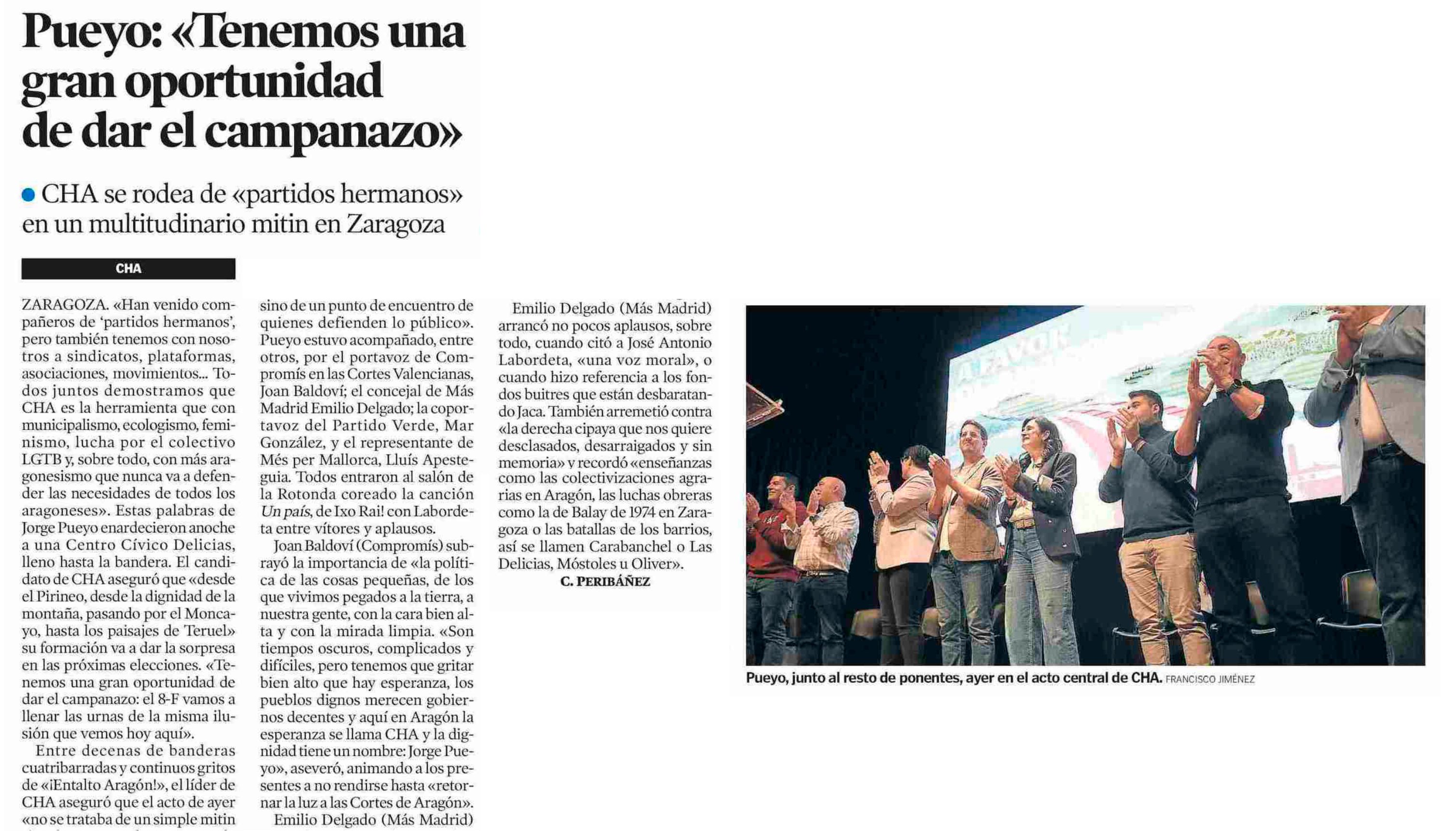 - Chunta saca su vena más aragonesista en el mitin central del 8F: “Vamos a dar el campanazo”. (El Periódico de Aragón, 1/02/2026).