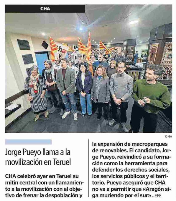 - Jorge Pueyo, en el cierre de campaña: “Votar a CHA es votar honestidad y a personas que construyen desde Aragón”. (Europa Press, 6/02/2026).