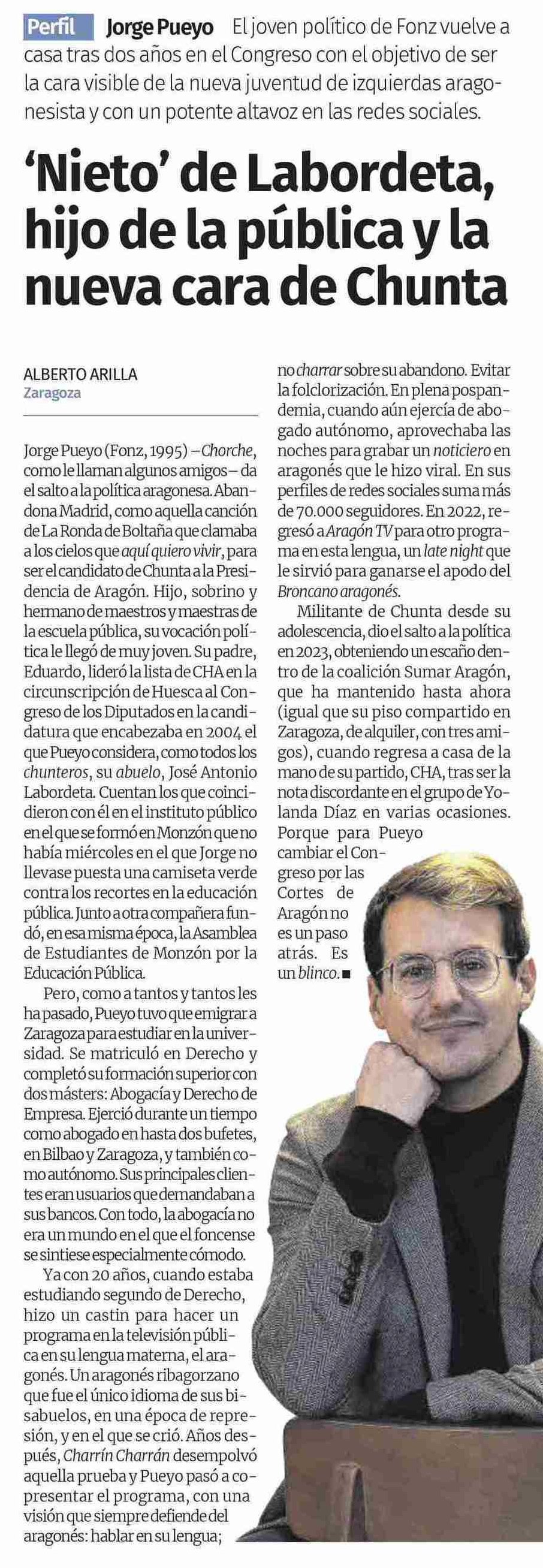 - Jorge Pueyo: ‘nieto’ de Labordeta, hijo de la escuela pública y la nueva cara de CHA. (El Periódico de Aragón, 2/02/2026). [papel]