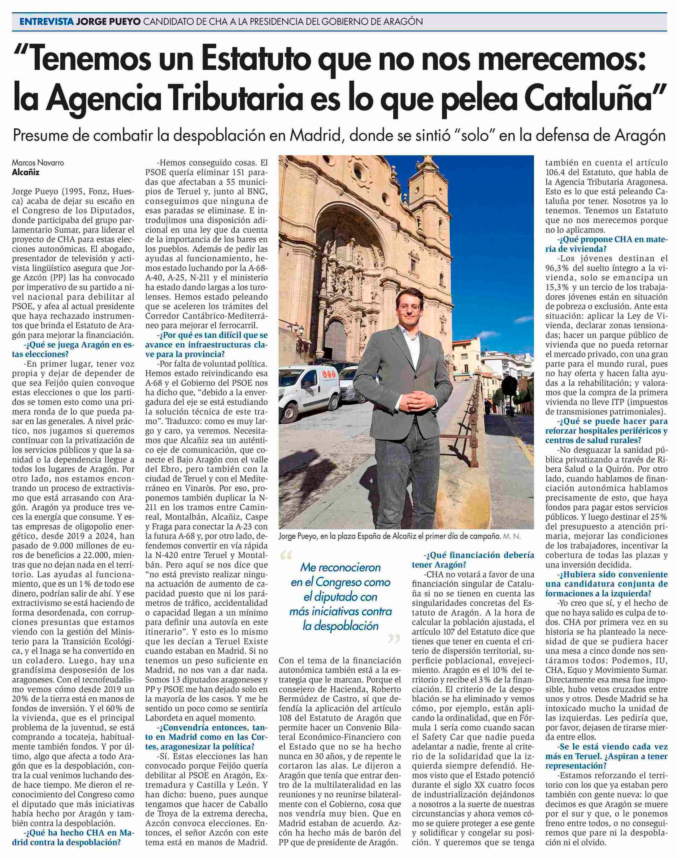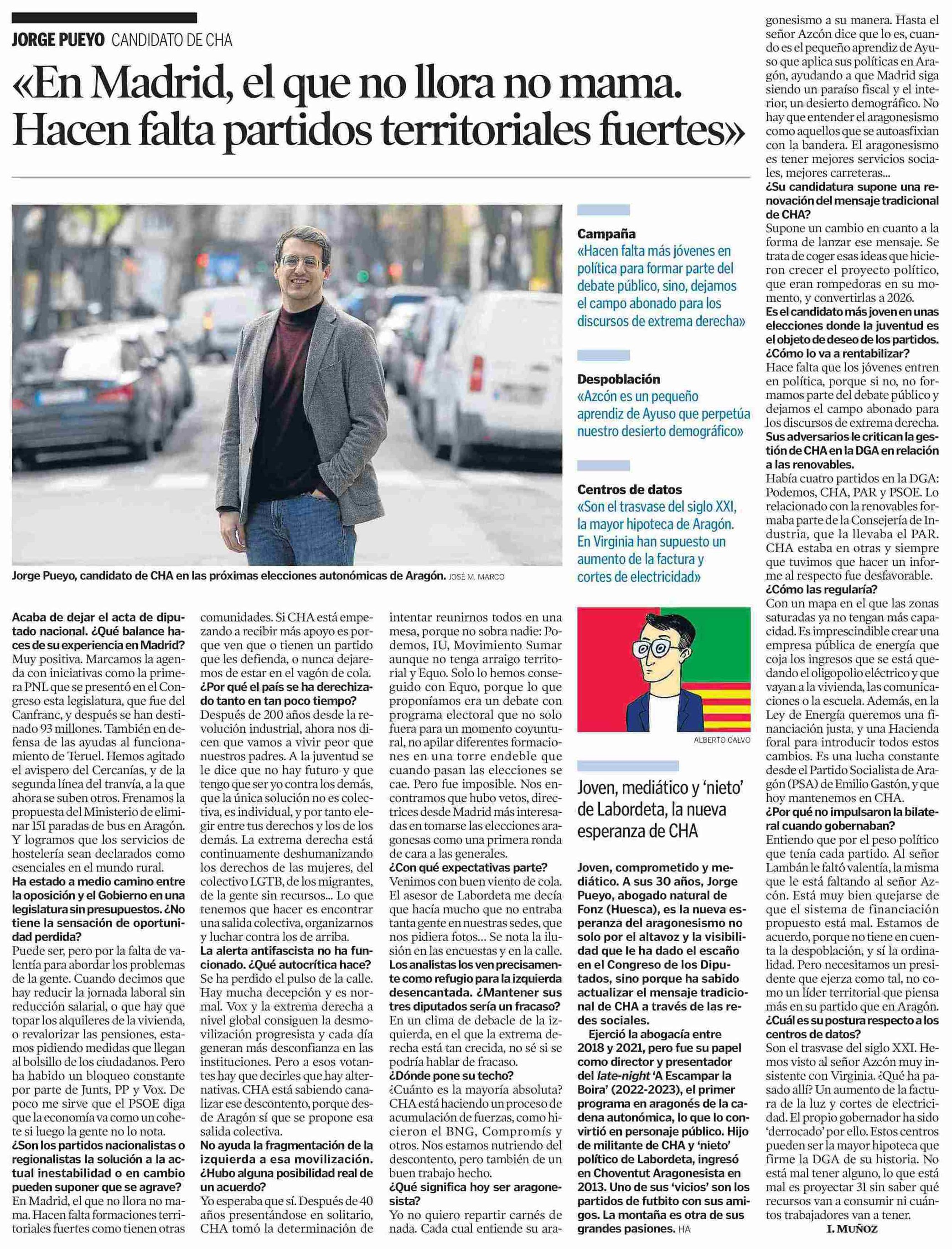 - Entrevista en Diario de Teruel, por Marcos Navarro. Jorge Pueyo, candidato de CHA a la Presidencia del Gobierno de Aragón: “Tenemos un Estatuto que no nos merecemos: la Agencia Tributaria es lo que pelea Cataluña”. (30/01/2026). [web] [papel]